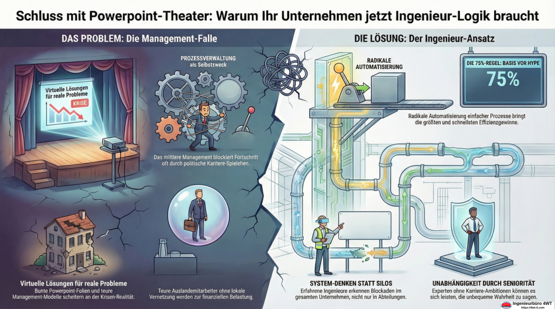 Wir von Ingenieurbüro 4WT sind ein Team von Experten, die Jahrzehnte in den Maschinenräumen der deutschen Wirtschaft gearbeitet haben – von der Börse bis zur Großbank. Wir haben Systeme aufgebaut, Krisen durchlebt und den Wandel der letzten 35 Jahre an vorderster Front mitgestaltet.Unser Ansatz ist nicht „nett“, er ist wirksam. Wir analysieren nicht nur Ihr Unternehmen, wir setzen um. Wir verschwinden nicht nach der Präsentation, sondern wir gehen erst, wenn der Prozess automatisiert und der Erlös gesteigert wurde. Damit tragen wir eine komplett andere Verantwortung als die üblichen Powerpointersteller.