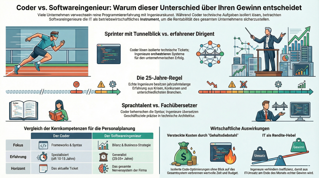 Ein Coder schreibt Code, ein Softwareingenieur sichert Ihren Unternehmensgewinn. Warum echte Expertise erst nach 25 Jahren beginnt und warum Sie in der Rezession keine Experimente bezahlen sollten. Ein Klartext-Kommentar von 4WT.