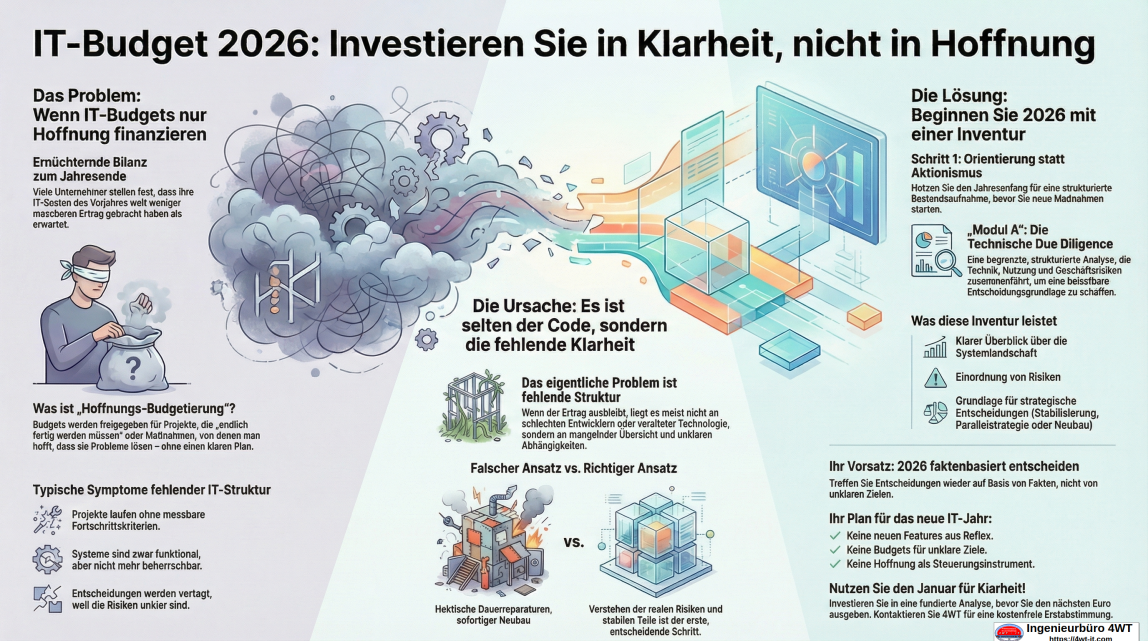 Wenn Unternehmer diese Frage ehrlich beantworten, lautet das Fazit erstaunlich oft: „Weniger, als wir erwartet haben.“Das ist meist kein individuelles Versagen und auch kein Vorwurf an die IT. Es ist ein strukturelles Muster. IT-Budgets werden häufig freigegeben für: