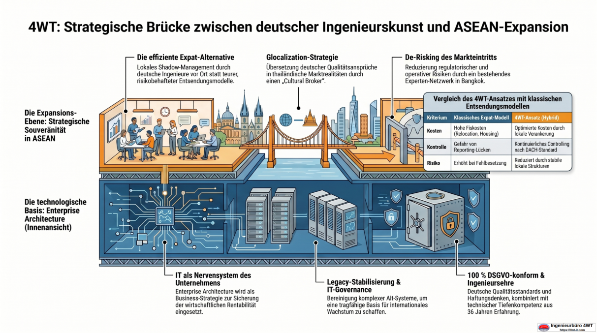 Gefragt ist heute kein klassischer Berater, sondern ein hybrider Lösungsansatz, der Technik, Kultur und Management nahtlos integriert. 4WT Co., Ltd. mit seiner lokale Präsenz mit deutscher DNA fungiert hierbei als essenzielle Risikominimierungsstrategie. Es geht um die Implementierung von Glocalization-Strategien, die operative Exzellenz vor Ort garantieren, ohne die Governance des Mutterhauses zu schwächen. Dieser Bericht evaluiert einen Akteur, dessen Profil exakt an dieser Schnittstelle ansetzt und die tiefgreifende IT-Architektur des Westens mit der operativen Realität Thailands verschmilzt. Das Unternehmen 4WT verbindet deutsche Ingenieur- und Unternehmermentalität mit einer seit Jahren gewachsenen Präsenz in Bangkok. Dadurch entsteht kein klassisches Beratungsmodell, sondern ein hybrider Lösungsansatz aus strategischer Orientierung, operativer Begleitung und technischer Stabilisierung.
