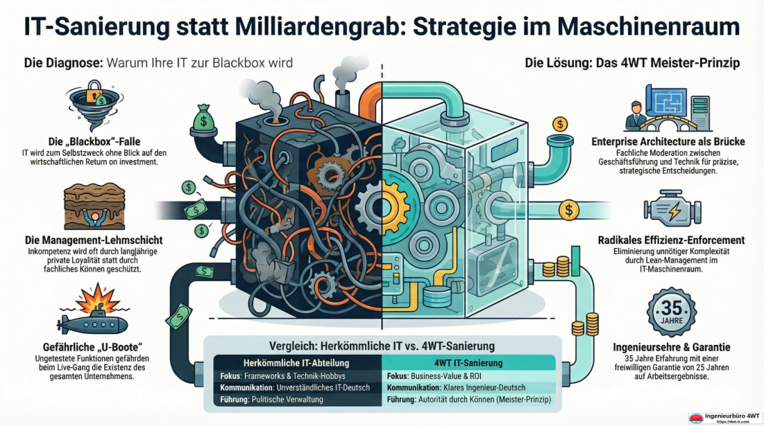 Wenn Sie als Inhaber oder CEO wachliegen, weil Ihr IT-Projekt mehr Budget verschlingt, als es Nutzen bringt, dann spüren Sie die Vibrationen im Maschinenraum bereits.Während Ihr mittleres Management Ihnen bunte Folien präsentiert, fährt Ihr Unternehmen vielleicht gerade ungebremst gegen eine digitale Wand.
